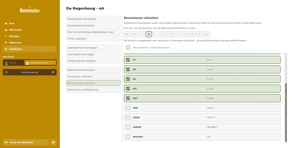 Wil je beperken welke bouwstenen gekozen kunnen worden door leerlingen of door ‘Automatus kiest’? Dan is “Bouwstenen uitsluiten” de instelling die je zoekt!