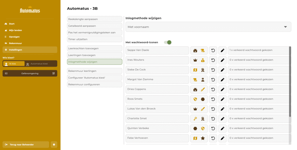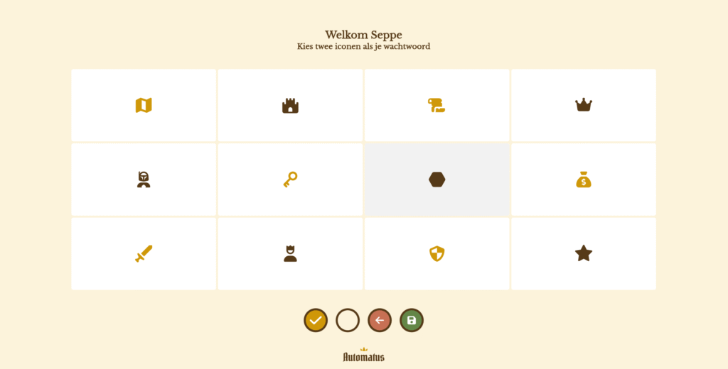 Zodra de leerling zich dan inlogt, krijgt hij de vraag om twee icoontjes te kiezen als wachtwoord. Vanaf de tweede keer kan hij inloggen door diezelfde icoontjes te kiezen bij de opstart van Automatus.